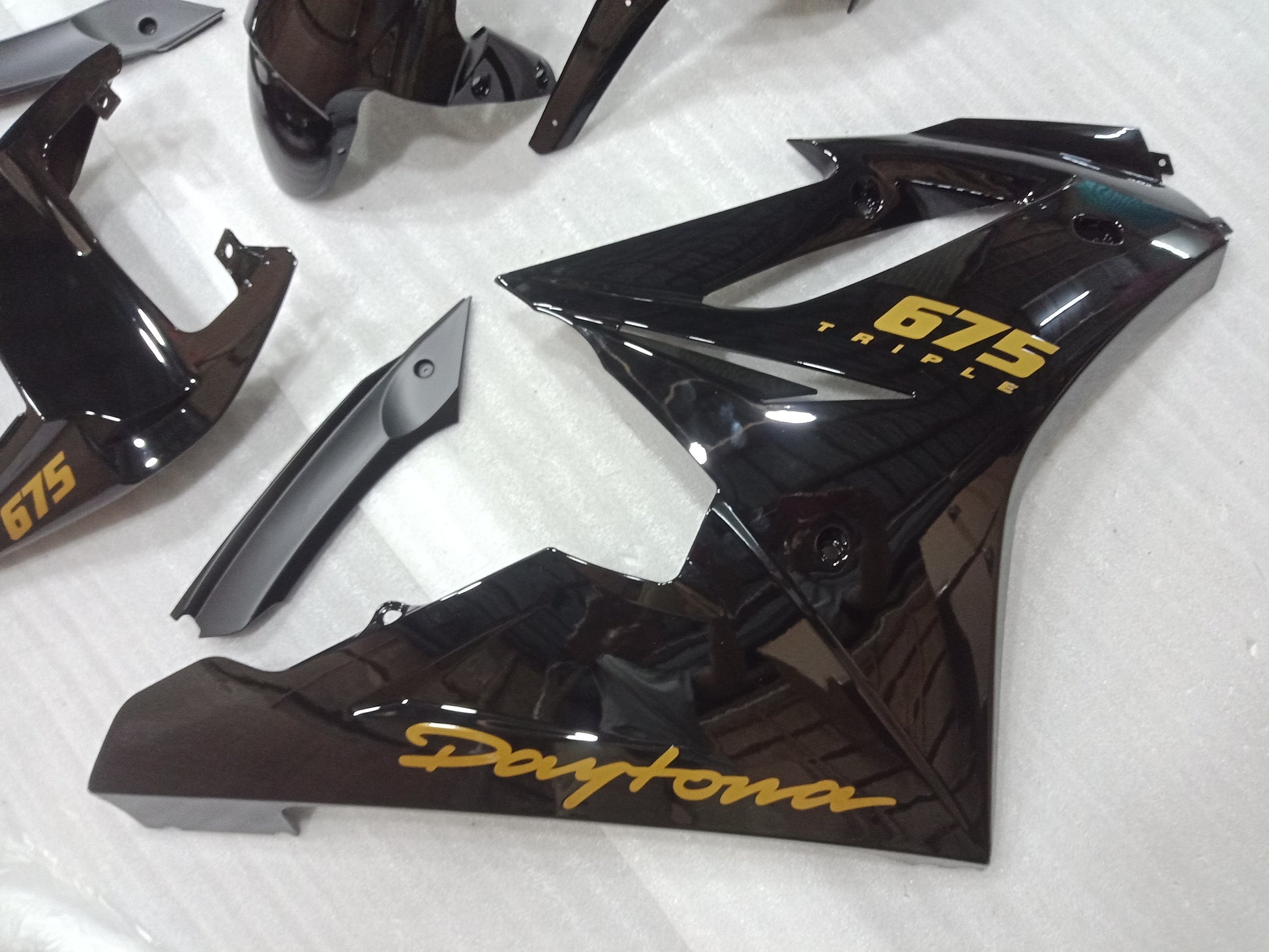 This set includes the front mudguard, front upper fairing, left and right sides, the belly pan or lower side panels, and the complete rear duck tail fairing for the 2009-2012 Triumph Daytona 675.